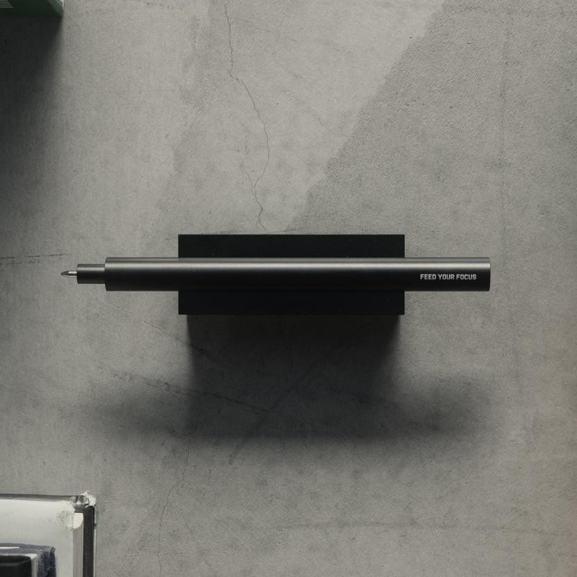 Minimalistička olovka za zapisivanje vaših ideja i namjera koja savršeno pristaje u priloženi stalak. Olovka je izrađena od eloksiranog aluminija s malim natpisom "feed your focus" koji služi kao podsjetnik. Olovka ima magnetski čep. Za ponovno punjenje uloška odvrnite stražnju ploču pomoću odvijača s ravnom glavom.